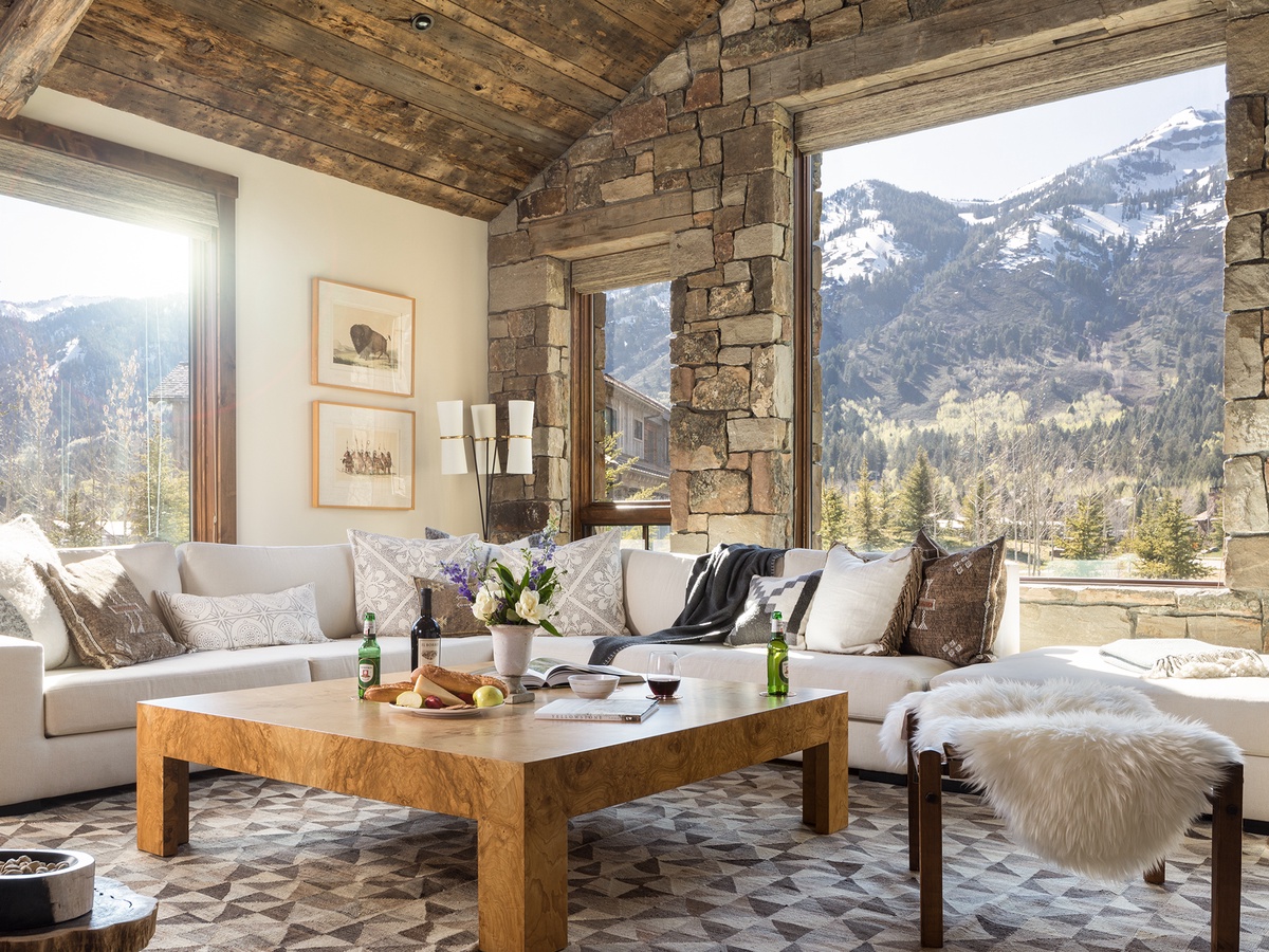 Inside, this mountain cabin combines the essence of the mountain west — think reclaimed timber, exposed stonework, and contemporary Western artwork — with modern conveniences like a professional grade kitchen, flat-screen televisions, and an efficient floorplan.